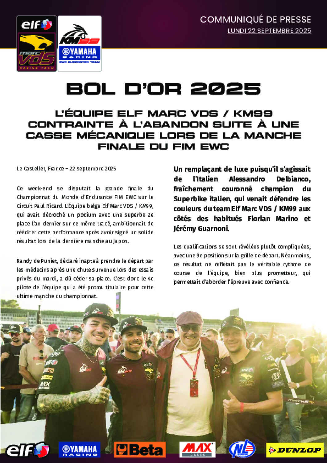 Ce week-end se disputait la grande finale du Championnat du Monde d’Endurance FIM EWC sur le Circuit Paul Ricard. L'Équipe belge Elf Marc VDS / KM99, qui avait décroché un podium avec une superbe 2e place l’an dernier sur ce même tracé, ambitionnait de rééditer cette performance après avoir signé un solide résultat lors de la dernière manche au Japon.